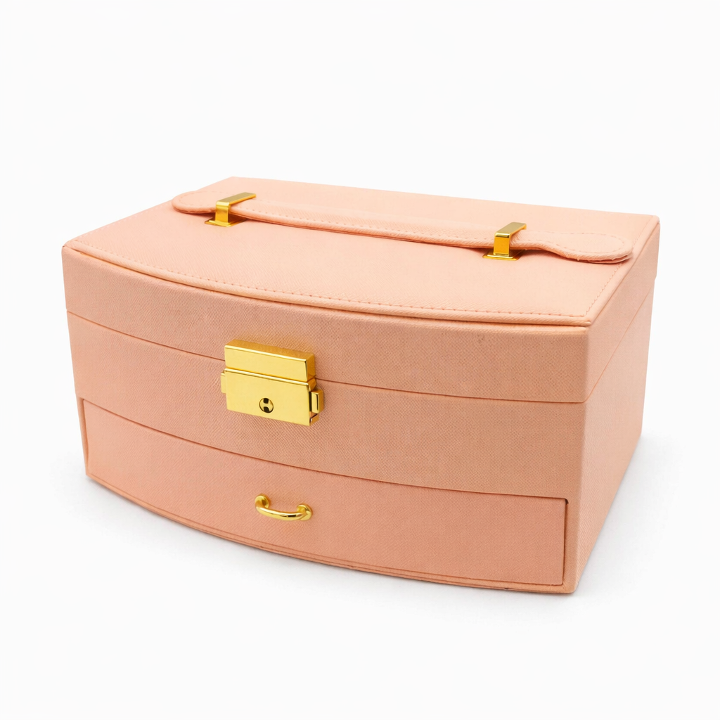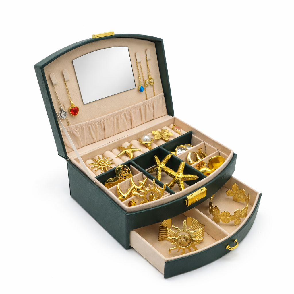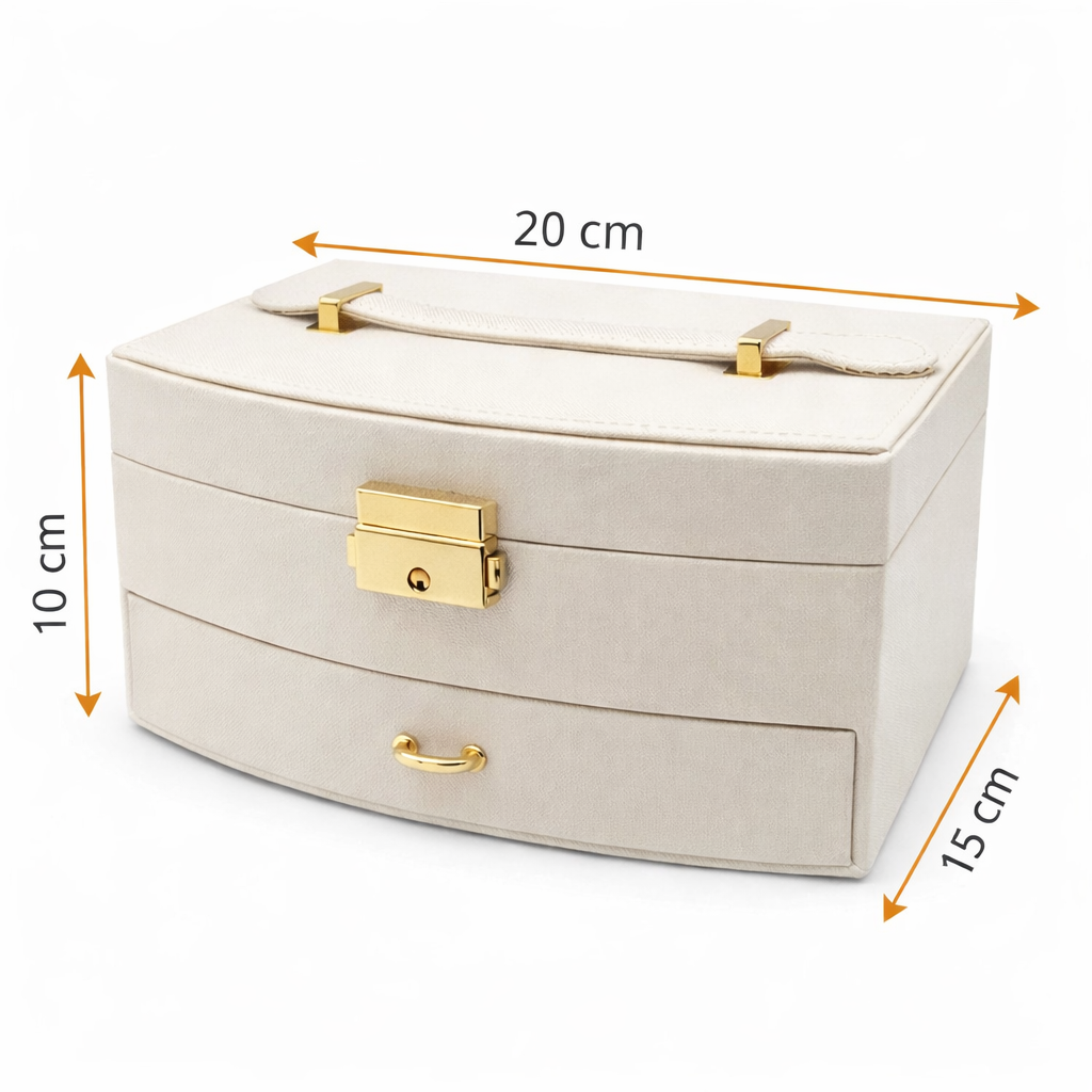 این جعبه جواهرات شیک دو طبقه و دارای ظرفیت نگهداری 11 عدد انگشتر بوده و با برخورداری از 4 قلاب مخصوص گردنبند به همراه جیب پارچهای ضد گره، نظم کاملی برای زیورآلات شما فراهم میکند. وجود 6 محفظه مجزا برای گوشواره و زیورآلات ریز و یک محفظه بزرگ در وسط و کشوی پایینی چهار بخشی مخصوص نگهداری ساعت و دستبند، فضای کاربردی و جاداری را ایجاد کرده است. آستر داخلی مخملی نرم و ضدخش از زیورآلات در برابر آسیب محافظت میکند و قفل فشاری فلزی با آبکاری طلایی امنیت و جلوهای لوکس به محصول میبخشد. همچنین این جعبه با دسته حمل مقاوم و طراحی شیک، گزینهای ایدهآل برای استفاده روزمره و هدیهای خاص و ارزشمند محسوب میشود.