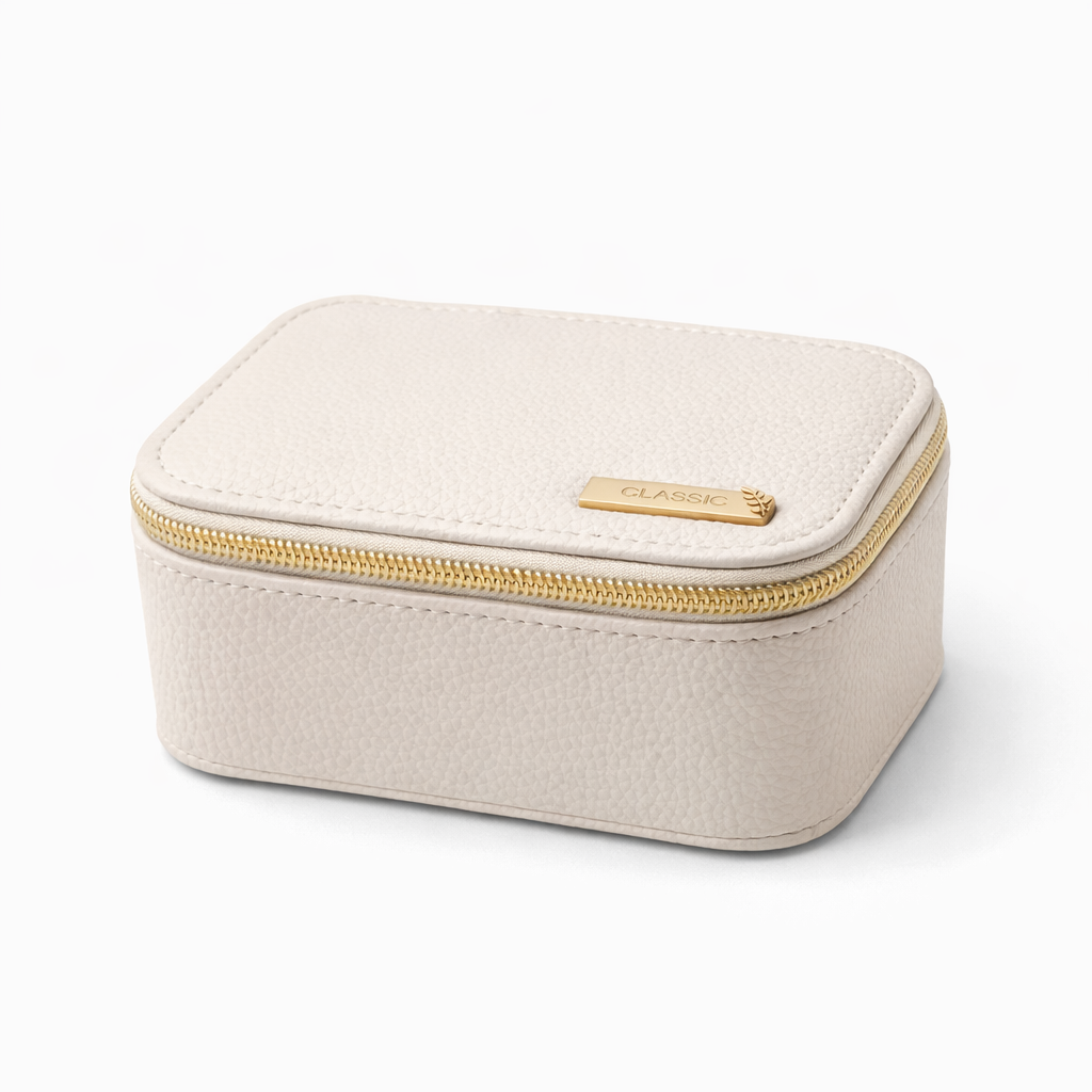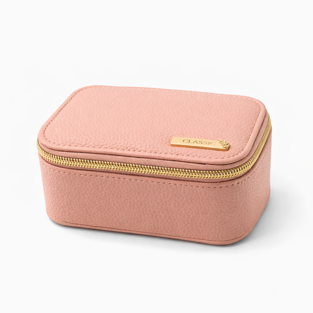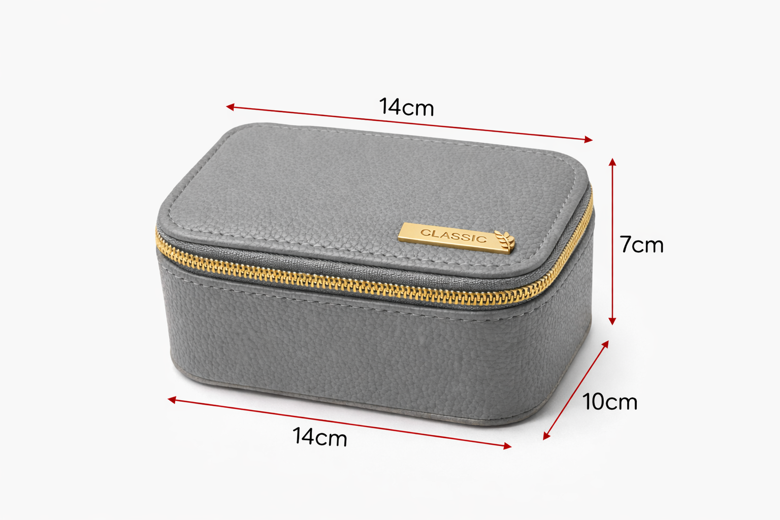 توضیح مختصر: جعبه جواهرات چرمی زیپدار مدل کلاسیک با طراحی شیک و ابعاد جمعوجورو کیفیت بالا، انتخابی کاربردی برای نگهداری ایمن و منظم انواع زیورآلات است.